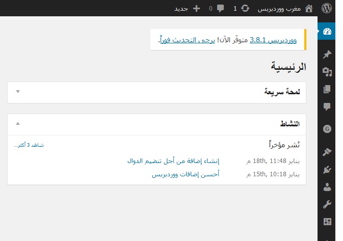 الآن يمكنك التحديث يدوياً، أو الإنتظار حتى يتم التحديث تلقائياً إلى ووردبريس 3.8.1 (إذا كانت إعداداتك تسمح بذلك).
