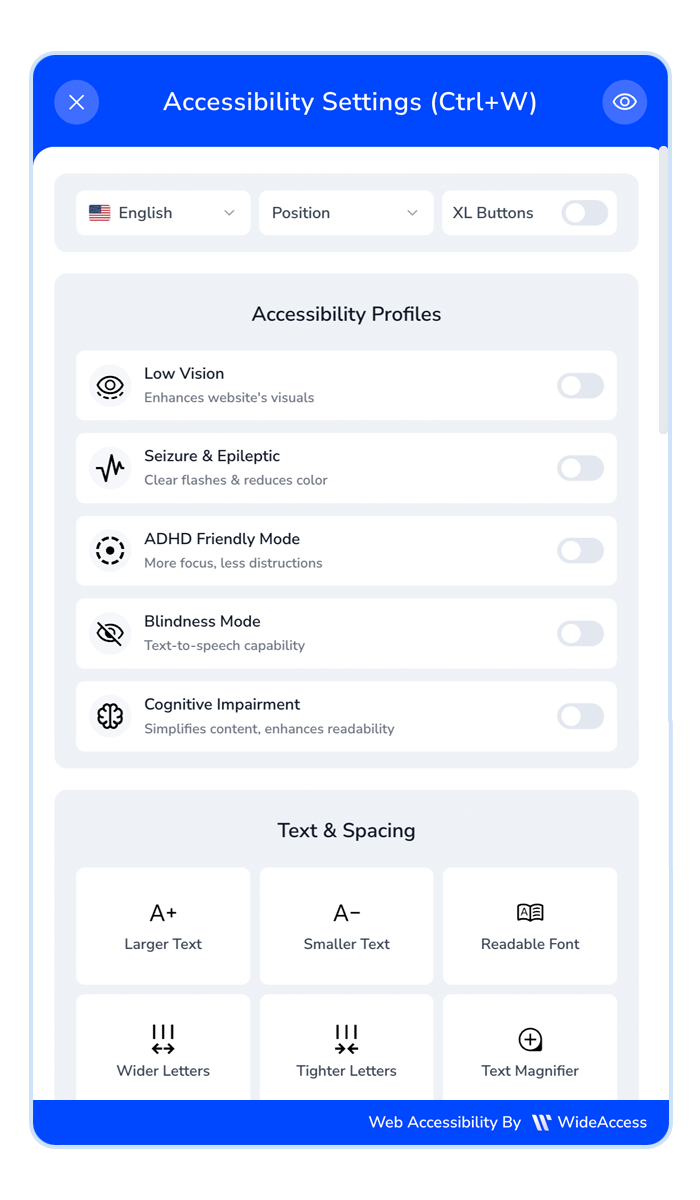 Our accessibility widget provides 23 tools + 5 ready-to-use profiles that allow every visitor to personalize their browsing experience. From text magnifiers and dyslexia-friendly fonts to color contrast controls and keyboard navigation, WideAccess empowers all users to access your content comfortably.